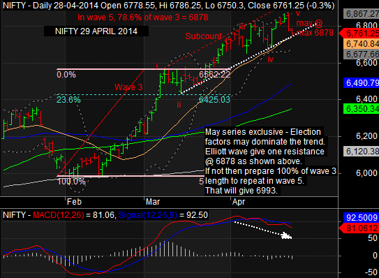 29 April 2014: Nifty Elliott wave analysis: 20 DMA support came at 6740 now. If it sustain below 6740 then it will test lower levels. Trend may not change even after any big sell off. Key short term support – 6650-6630!!!
