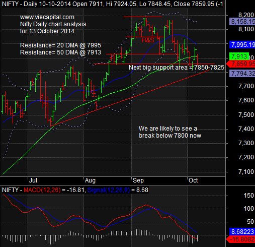 13 October 2014: Nifty Elliott wave analysis: Once again, have an eye on 7800 levels. Break below 7800 will cause some panic sell off. Nifty may be heading towards 7600-7500.